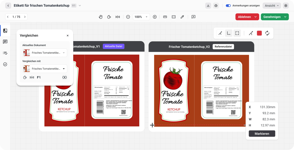 - Vergleichen Sie wichtige Details wie Barcodes, Texte, Grafiken und Schneidelinien.
