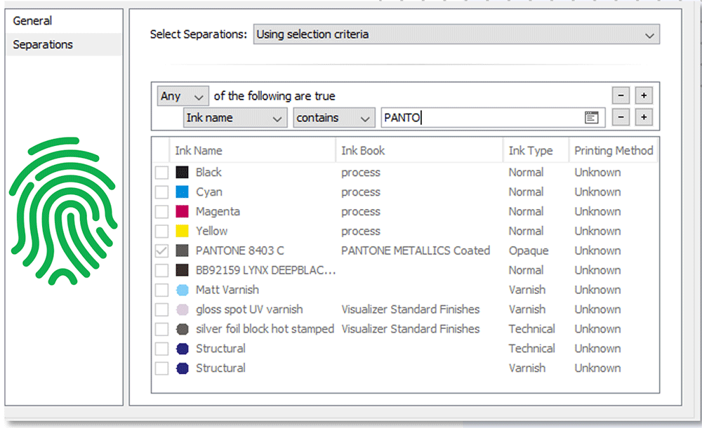 - Rule-based mode means users can specify separation by “Name”, “Ink book”, “Printing method”, and “Type”.