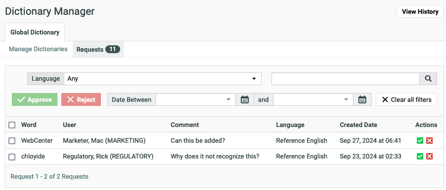 - The new spelling and dictionary management features provide an easy way to correct text, manage dictionaries, and ensure content consistency. Users can quickly identify and correct misspelled words, request updates to the Global Dictionary, and administrators have full control over custom dictionaries, making it simpler to maintain standardized, error-free content.