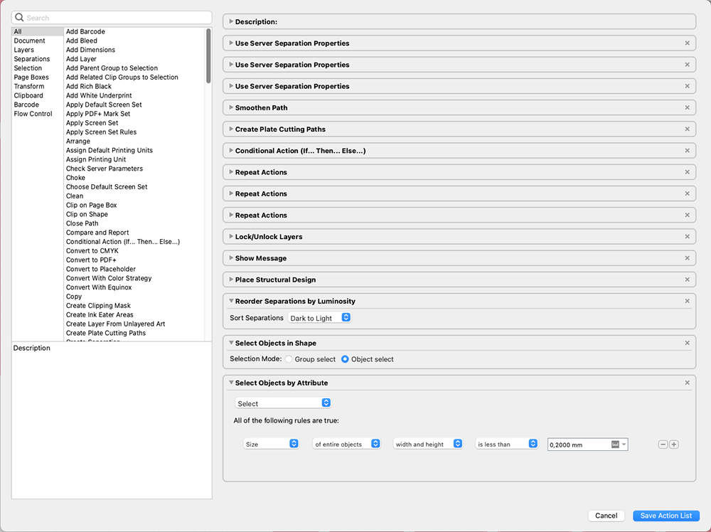 - New additions to PDF Action Lists allow operators to select objects by shape and size and reorder separations by luminosity (Sort Separations from lightest to darkest or vice versa. These automation-ready features reduce manual effort, improve ink management, and accelerate prepress productivity.