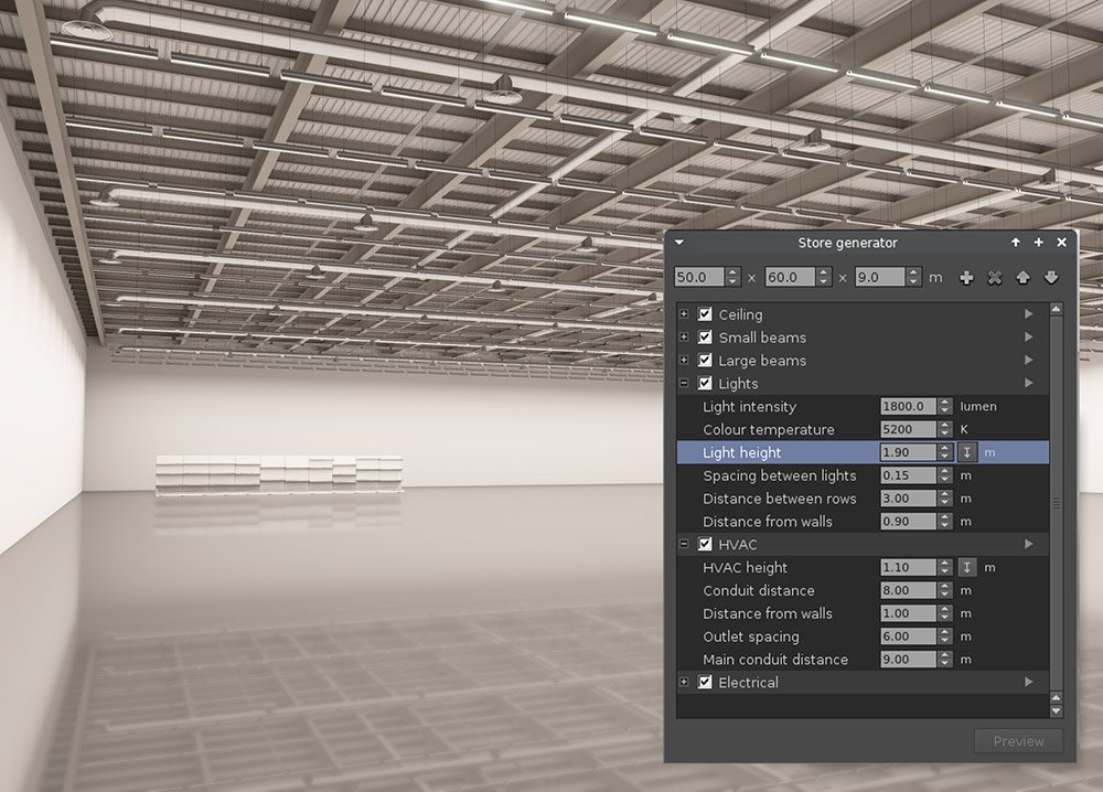 - Set the size and floor space, customize lighting and the look and feel. They’re also resizable: once generated, change your store on the fly, even within an existing project.