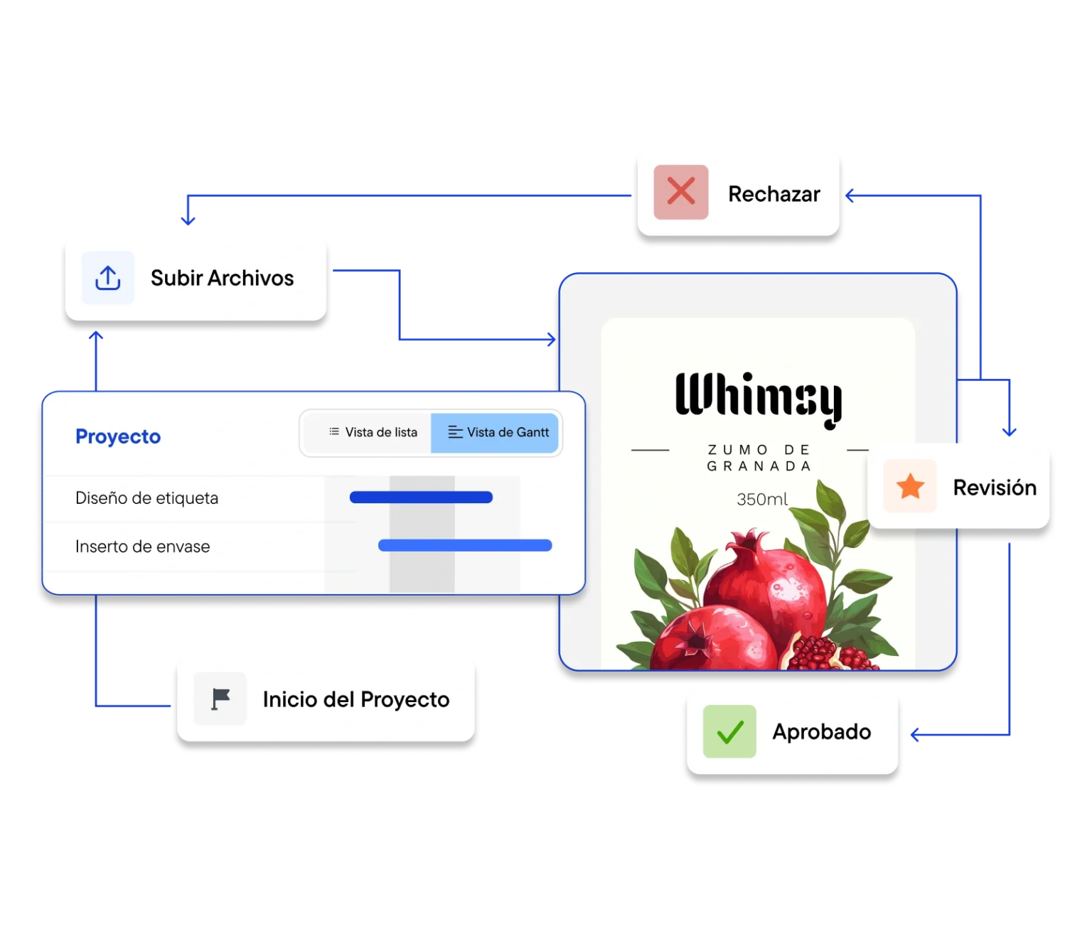 Construye flujos de trabajo tanto secuenciales como paralelos para gestionar todo el proceso de packaging, desde la entrega del diseño hasta la aprobación final.