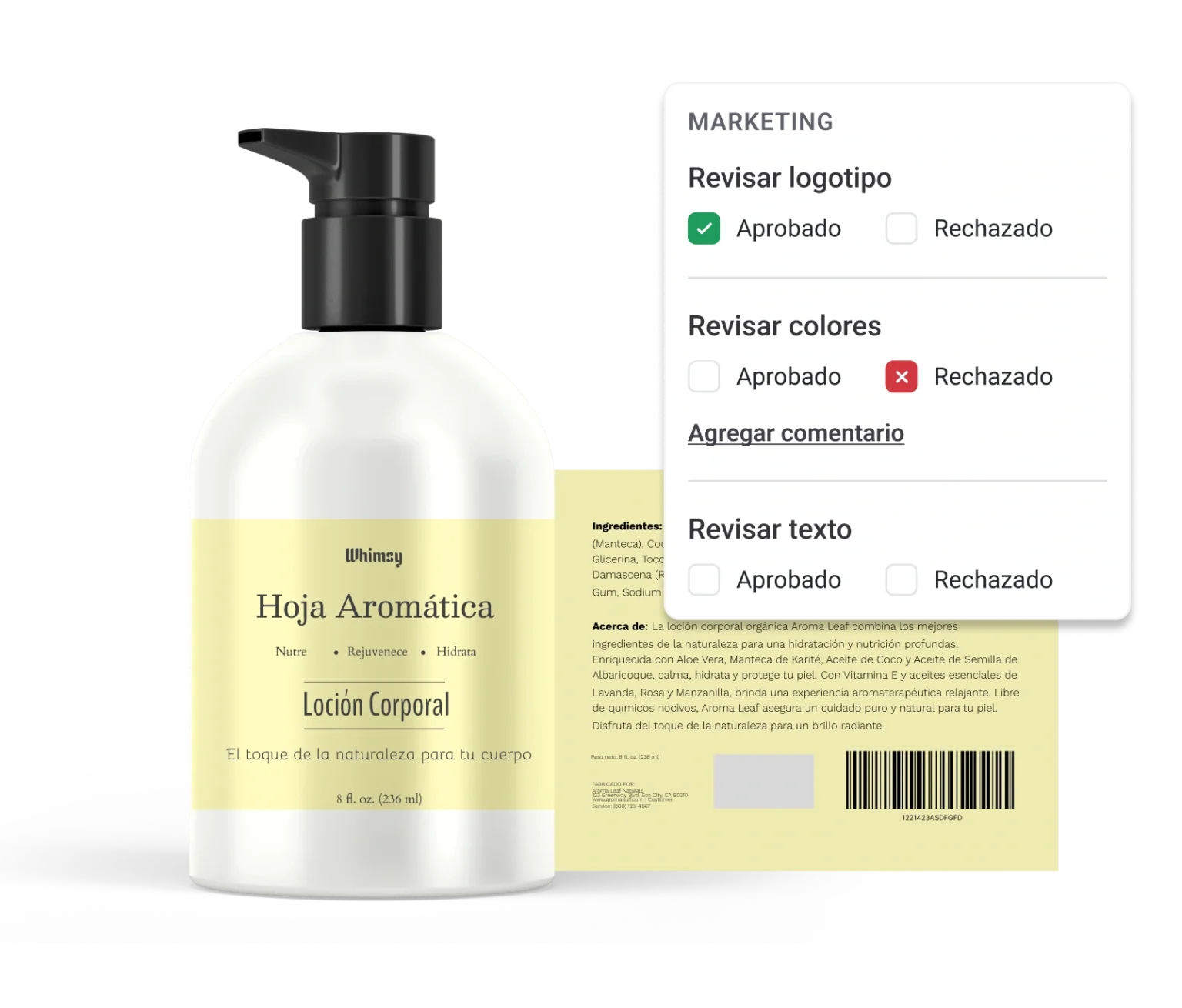 Revisa etiquetas, folletos, insertos y otros elementos con controles integrados de idioma y estilo.